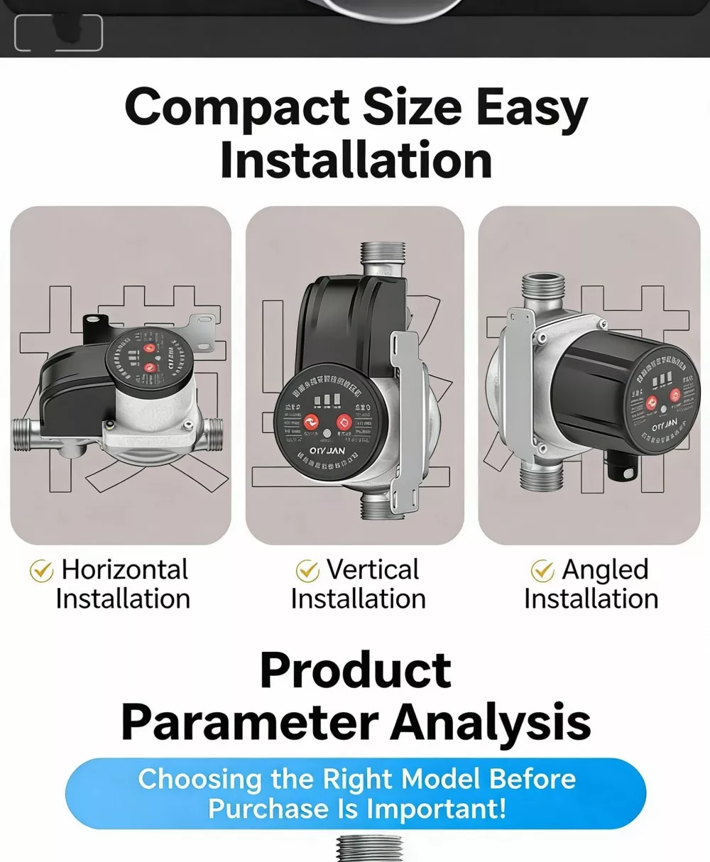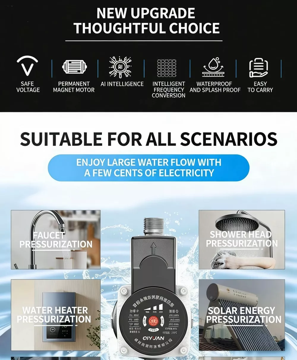Surpression de l'eau du robinet domestique/des canalisations solaires : Adaptable à divers scénarios d'approvisionnement en eau à basse pression tels que les conduites d'eau du robinet domestiques et les systèmes d'approvisionnement en eau solaires, réalisant une augmentation de pression stable dans tous les scénarios.