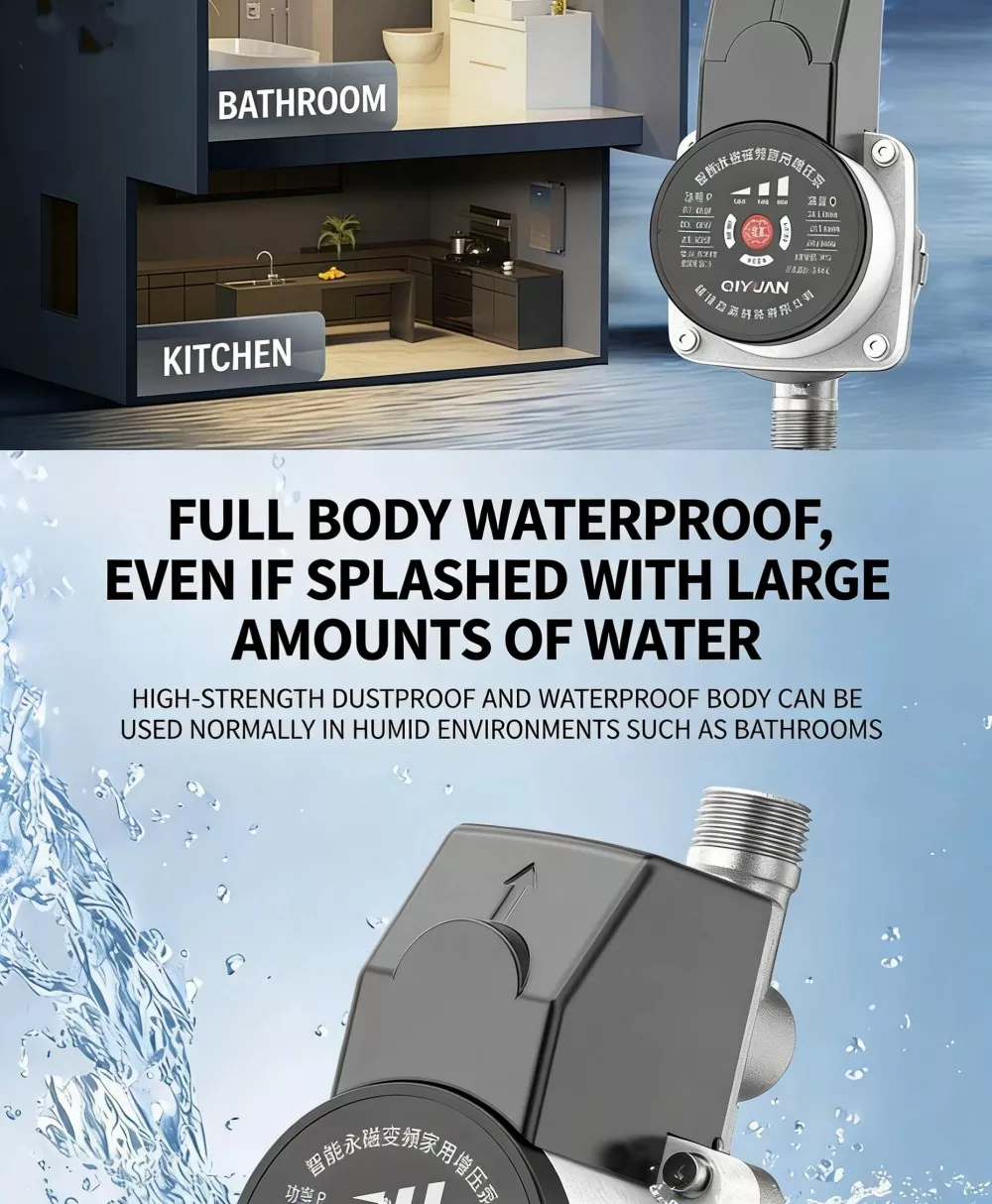 Le capteur de débit d'eau haute sensibilité intégré démarre automatiquement la pompe lorsque la consommation d'eau est détectée et l'arrête avec un délai après la fin de l'utilisation de l'eau, évitant ainsi le vieillissement des composants et la perte causée par des cycles de démarrage et d'arrêt fréquents. Il est également équipé d'une protection contre la marche à sec sans eau : le corps de la pompe s'arrête automatiquement lorsque la canalisation manque d'eau, empêchant ainsi le moteur d'être endommagé par la combustion à sec, améliorant encore la fiabilité et la stabilité du fonctionnement de l'équipement.